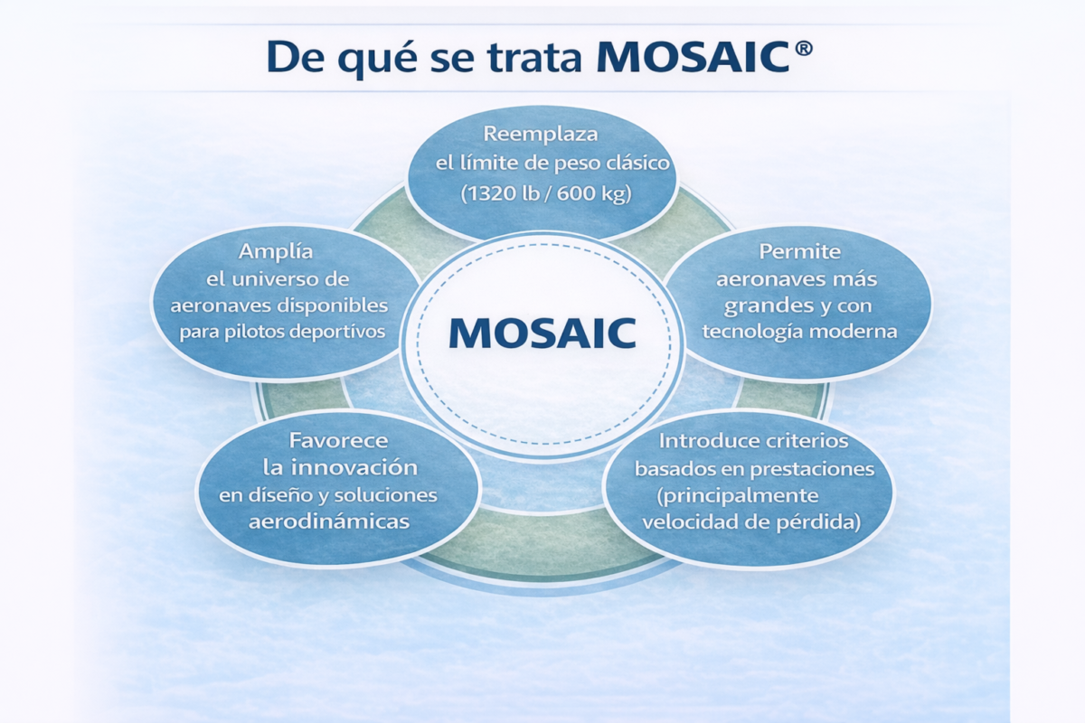 Con MOSAIC, la FAA propone un cambio conceptual. En términos simples, se pasa de regular el acceso a la aviación deportiva por el peso de las aeronaves a hacerlo por su comportamiento aerodinámico y sus prestaciones reales. En lugar de limitar el peso de la aeronave, el nuevo marco regulatorio evalúa parámetros de performance —como la velocidad de pérdida— para determinar si un avión puede ser operado dentro del universo de la aviación deportiva. Este enfoque abre la puerta a aeronaves más grandes, con mayor capacidad, mejor equipamiento y tecnologías más modernas.